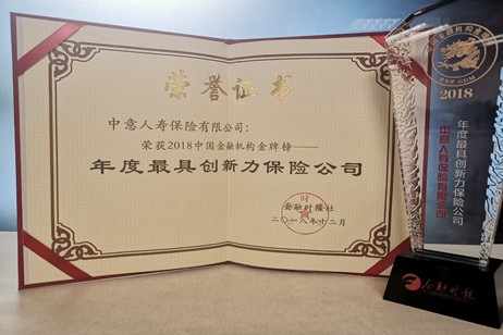 中意人寿在金融时报社与中国社会科学院金融研究所主办的“中国金融机构金牌榜●金龙奖”活动中获得“2018年度最具创新力保险公司”的殊荣。