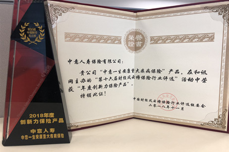 中意人寿“中意一生安康重大疾病保险产品”在和讯网主办的“第十六届财经风云榜保险行业评选”活动中获得“年度创新力产品“的荣誉。