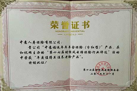 中意福运年年年金保险(分红型)获“年度值得关注养老险产品”--证书