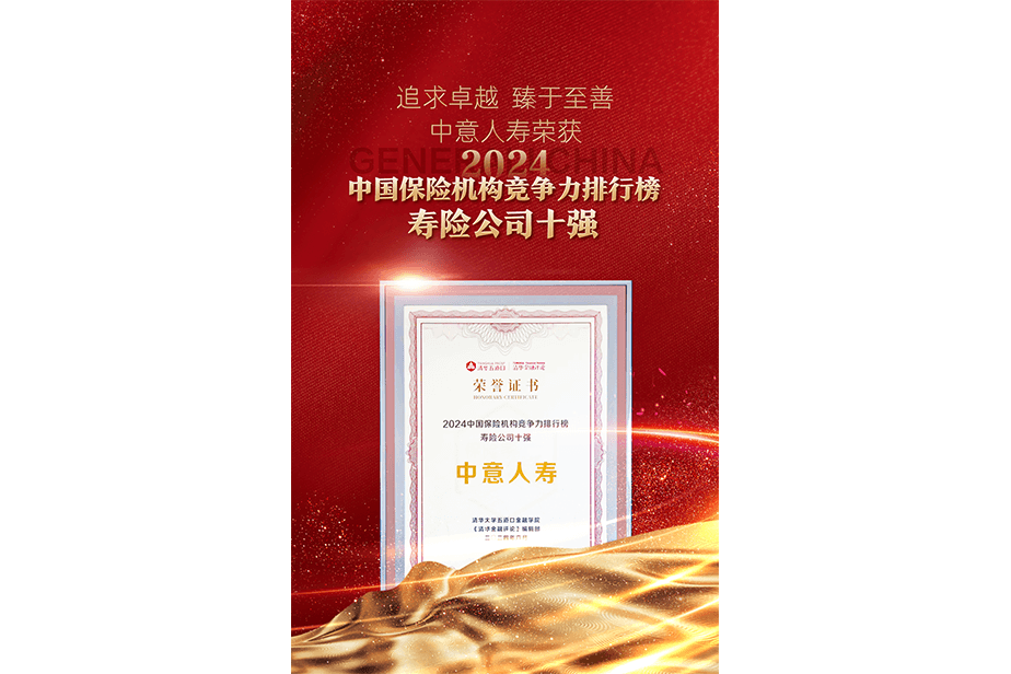 中意人寿荣获2024中国保险机构竞争力排行榜寿险公司十强