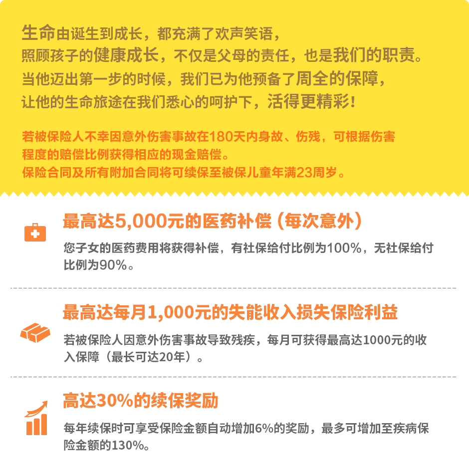 投保年龄:30天 — 17周岁(可续保至23周岁)